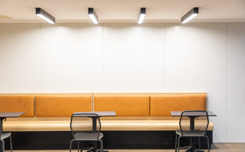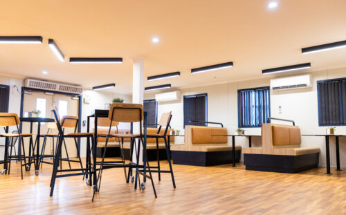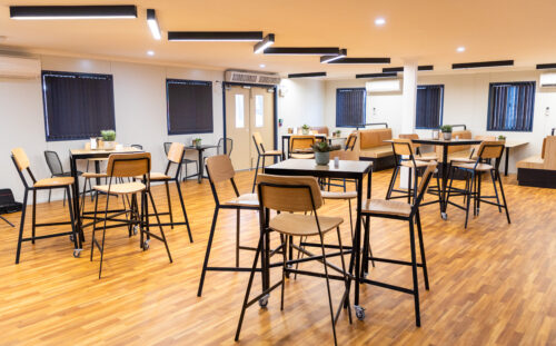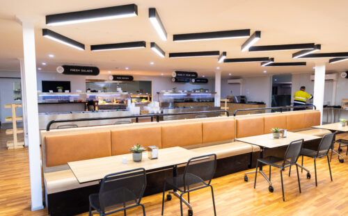 - A custom kitchen and dining area with specialised booths, a café-library zone, and LED lighting