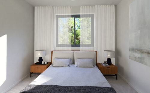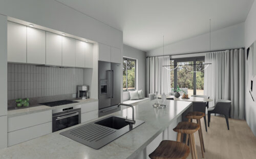 This contemporary two-bedroom, two-bathroom home is designed with modern living and entertaining in mind. The raked ceilings to the open-plan living area adds to the sense of spaciousness, further enhanced by its connection to two alfresco areas. The Cove is an ideal solution for lifestyle villages, community focused housing and work accommodation. Combining functionality, style, and comfort.